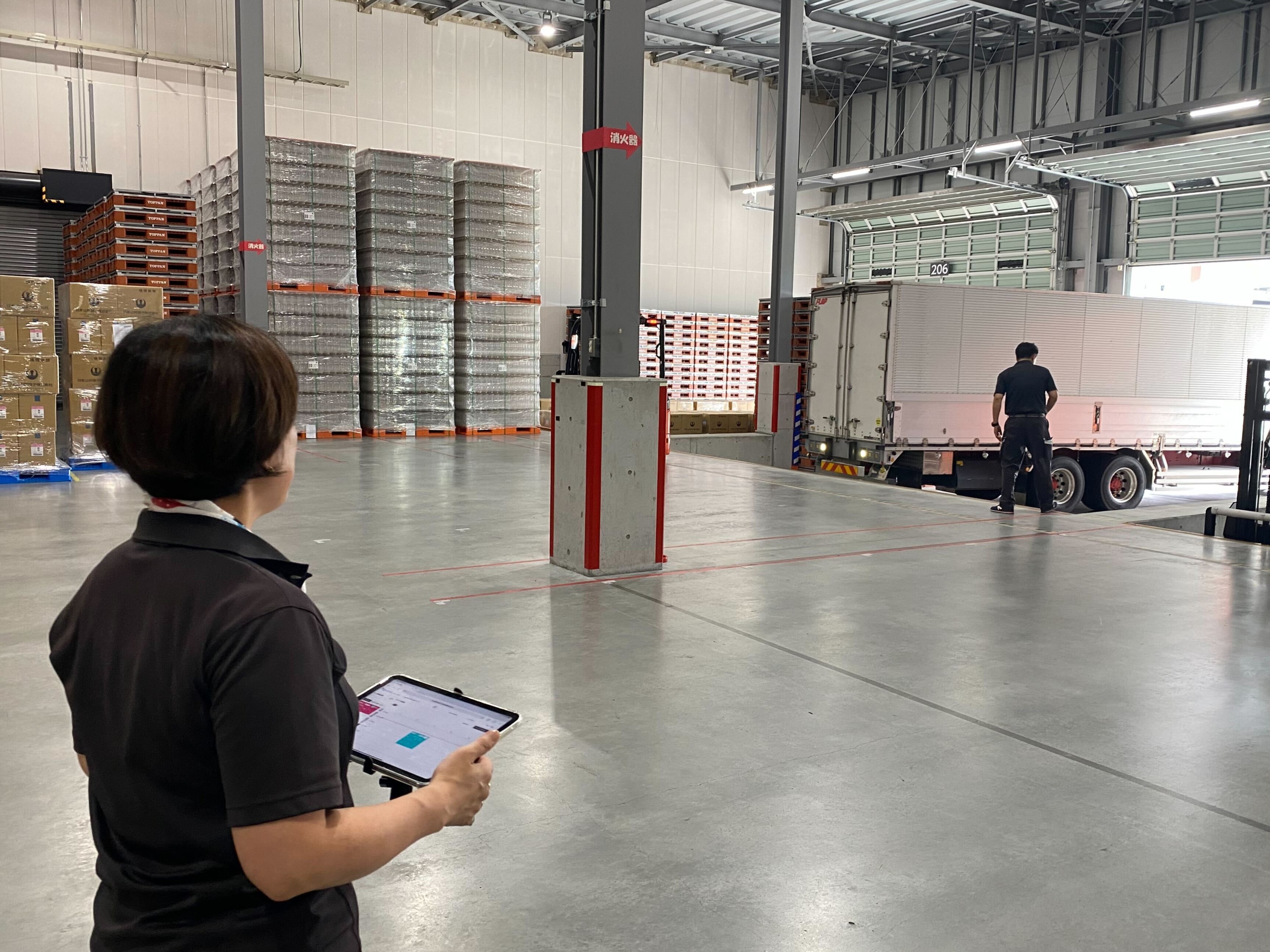 望月:ドライバーさんに受付のタブレットで入力してもらい、リフト乗務員が現場のタブレットからトラックを呼び出す流れに変わりました。1台呼ぶごとに受付に行く手間がなくなりましたし、待機中の車両が一覧できるので呼び忘れもありません。また、積荷や荷台の仕様が事前にわかるようになったことで、誘導から積み降ろしまでのムダも減りましたね。限られたスペースで荷捌きの準備ができるなど、荷役時間の短縮につながっています。