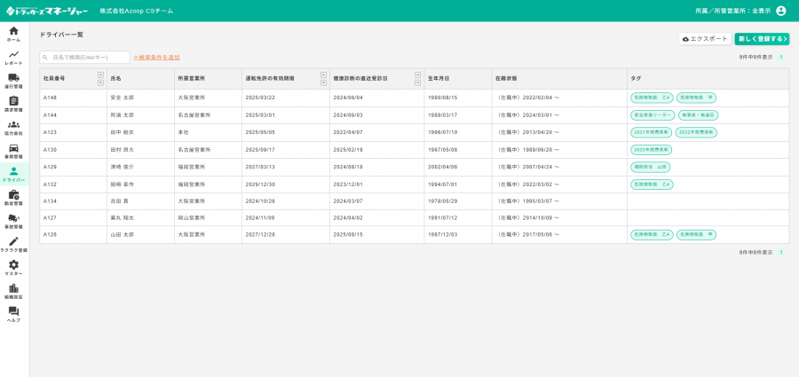 吉岡様:更新自体はされているものの、ドライバーの情報を最新版に差し替えられていないなどは多々ありました。ドライバーの入れ替わりも多く、200名ほど在籍しているので管理しきれていなかったと思います。日雇いの方などもいらっしゃるので雇用契約もバラバラで、個人情報の管理や整備も追い付いていませんでした。
