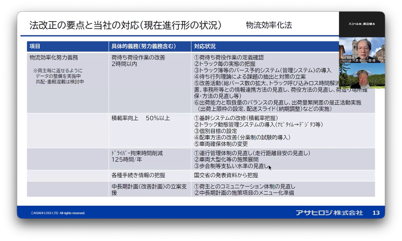 こうした物流業界の課題と今後の法改正に向けて、アサヒロジではどのような取り組みが行われているのでしょうか。島崎氏はまず、法改正の主なポイントと現状の課題を整理しました。