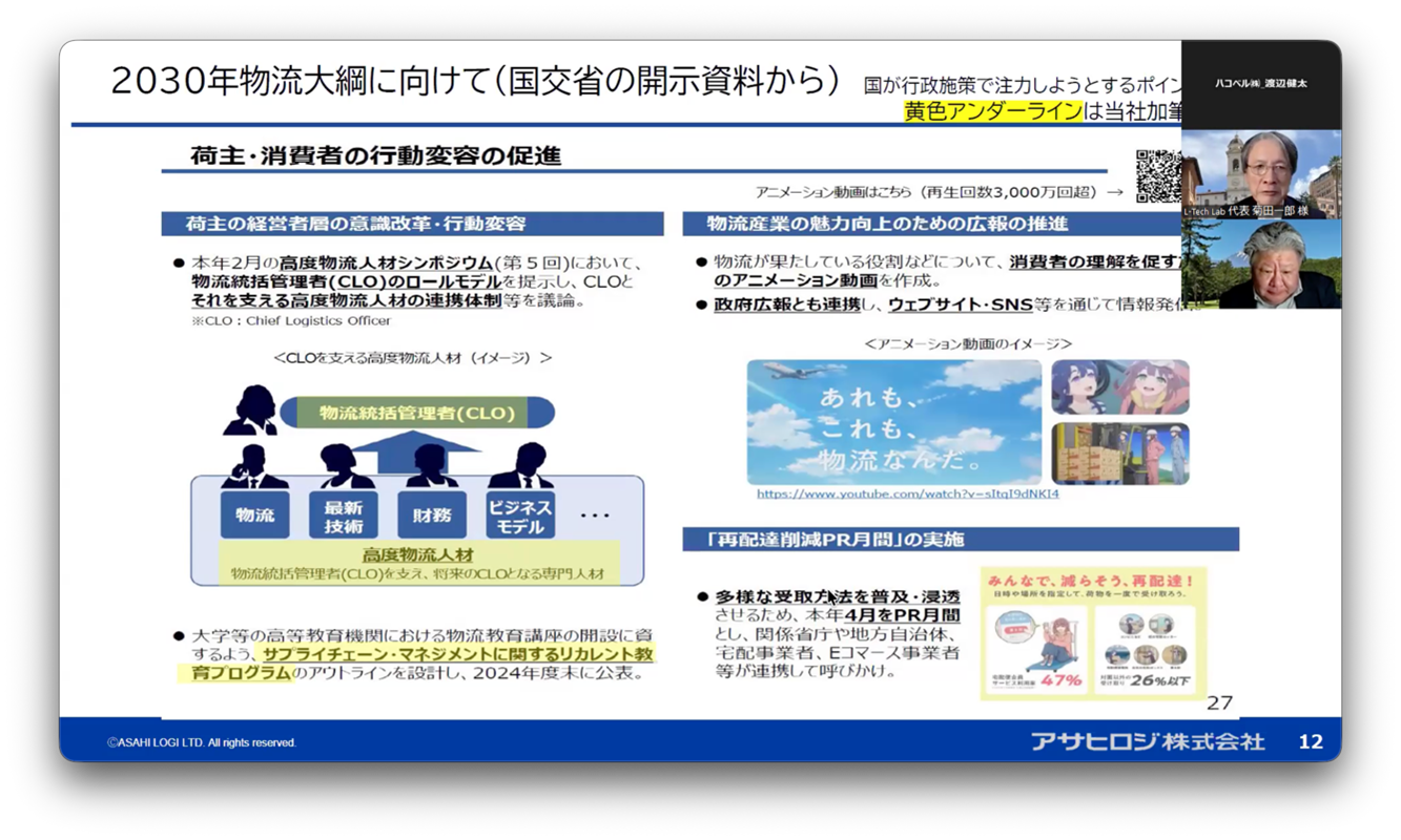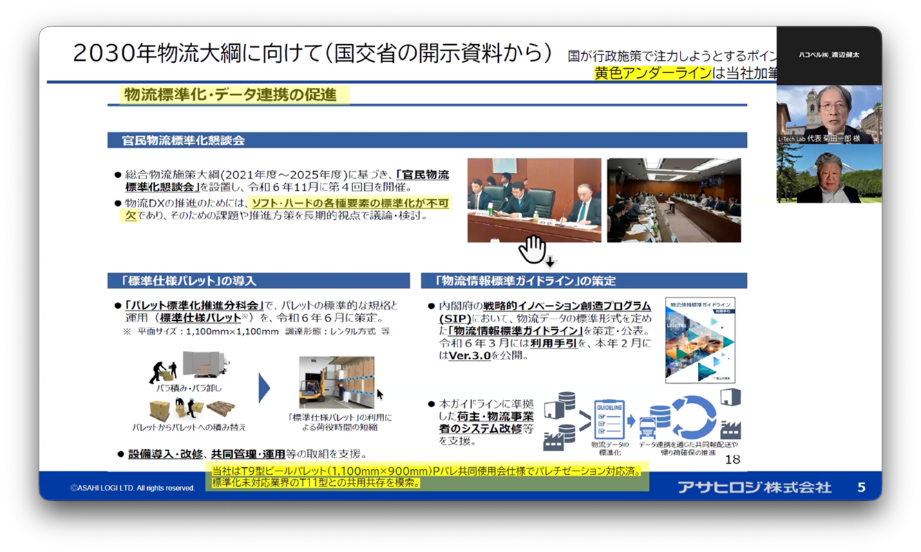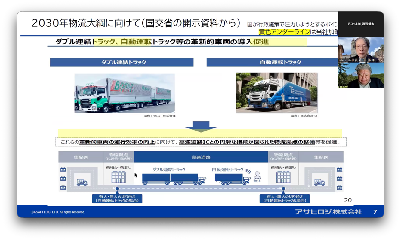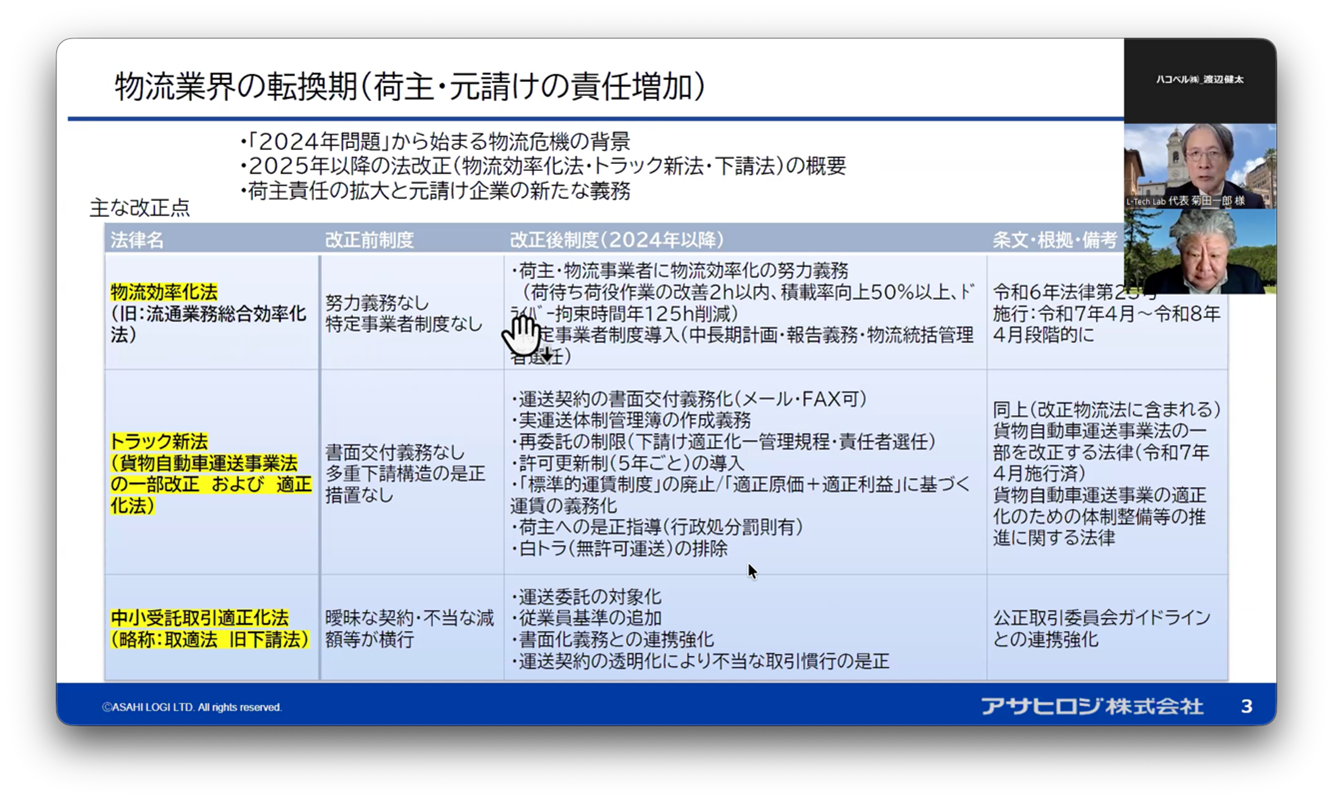 ハコベルは毎月、エルテックラボ代表の物流ジャーナリスト 菊田一郎氏をホストにオンラインセミナーをお届けしています。2025年11月は、アサヒロジ株式会 執行役員副社長 島崎市朗氏をゲストに、今後の法改正をはじめとする物流大変革時代の到来に向けた同社の取り組みについてお話しいただきました。