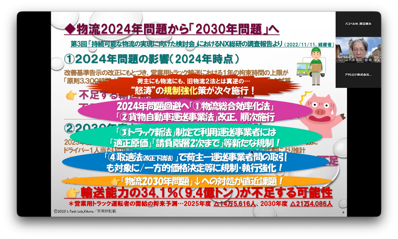 セミナー冒頭では「怒涛の物流法制大転換を概観する」と題し、菊田氏が「物流2030年問題」の課題と、これから進む物流関連の法改正の概要について解説しました。