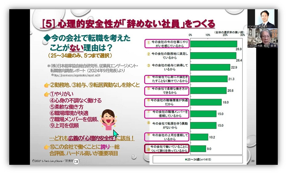 日本能率協会総合研究所が2024年9月に発表した従業員の転職意向レポートでも、転職を考えたことがない理由として「やりがい」「心身の不調なく働ける」「職場環境が快適」「職場の人を信頼している」など広義の心理的安全性に該当する内容が多く挙げられています。菊田氏は「心理的安全性は社内だけでなく、荷主と物流事業者の間でも必要」と強調します。