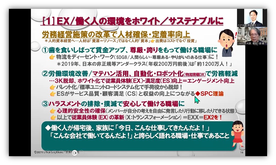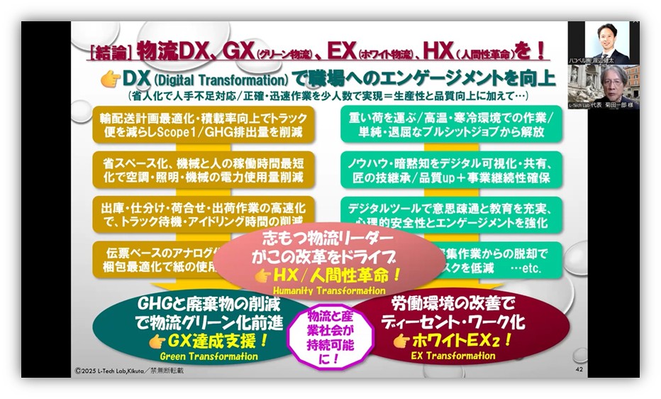 菊田氏は、人材の確保と定着のためには「物流DX」「グリーン物流:GX」「ホワイト物流:EX2」「人間性革命:HX」の推進が必要だと結論付け、「経営者、リーダーは使命感と覚悟を持って改革を積極的に進めてください。それが働く人のエンゲージメントを培い、物流と産業社会を持続可能なものにします」と結びました。