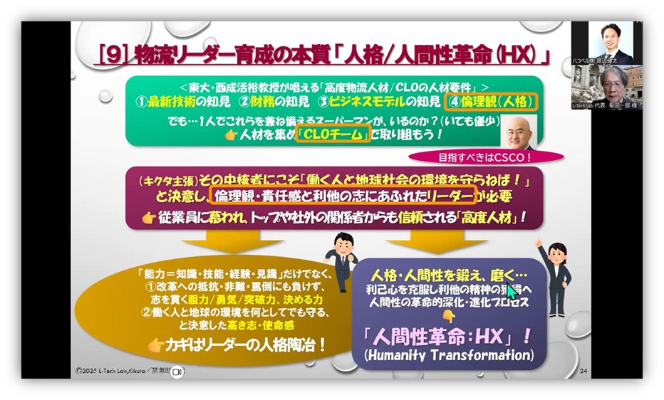 国交省が考える高度物流人材とは、データ活用力、サプライチェーンの管理能力、社会変化への対応力などを持った人物です。しかし、知識・技能・経験だけでは十分とは言えません。問われるのは「人間力」ではないでしょうか。東大の西成活裕教授も、高度物流人財/CLOの要件は「最新技術の知見」「財務の知見」「ビジネスモデルの知見」「倫理観(人格)」であり、チームで取り組むべきだと主張しています。