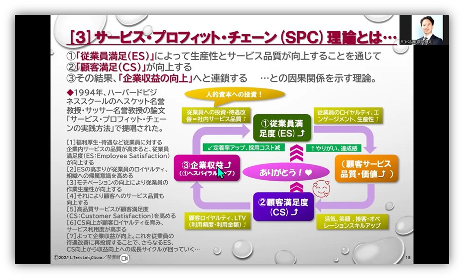 これらの施策がもたらす効果をいくつか挙げましょう。ひとつは「サービス・プロフィット・チェ-ン(SPC)理論」です。待遇を改善すると、従業員の満足度が向上し、すると従業員は意欲を高めるので生産性が上がり、商品やサービスの品質が向上します。これにより顧客満足度が上がり、利用頻度や利用額が増えて収益が向上する正のサイクルが回り始めます。定着率が上がり、採用や教育コストも減らせます。高い品質に対する顧客の感謝が従業員に伝わって、やりがい向上につながった事例も現実にあります。