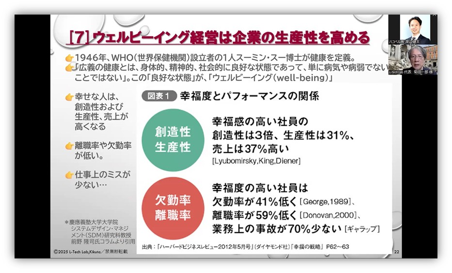 それからウェルビーイング経営。幸福感の高い社員は創造性・生産性・売上が高く、欠勤率や離職率が低く、業務上の過失も少ないという調査結果があります。