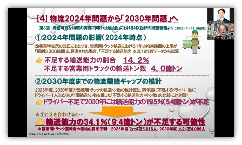 菊田氏は以前から、物流革新の最終目的は「物流と地球社会を持続可能にすること」にあり、その鍵は「働く人の環境保全」と「地球と社会の環境保全」の2点であると主張しています。その基本前提を話し、今日は主に「働く人の環境保全」の話であると述べました。また、現在の物流危機に至る背景と政府の打開策について説明しました。
