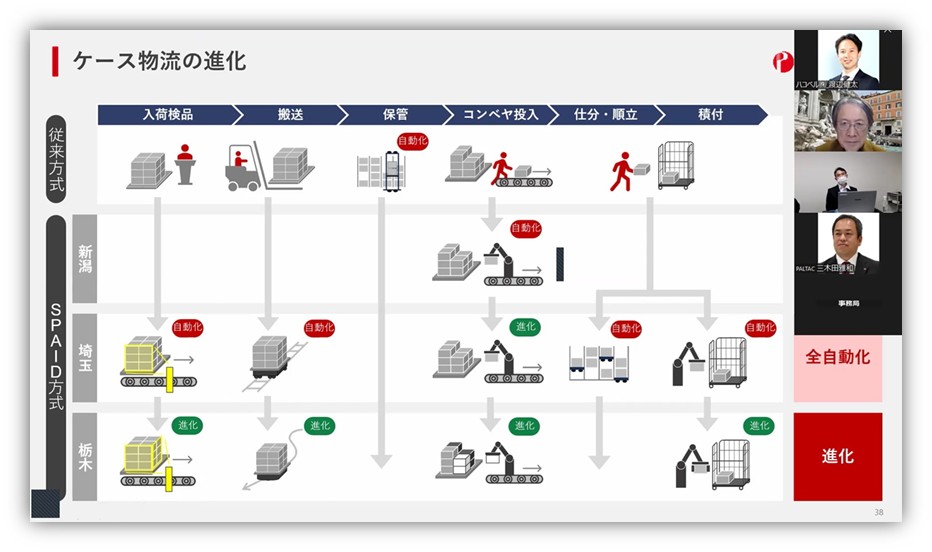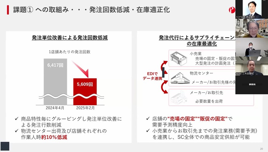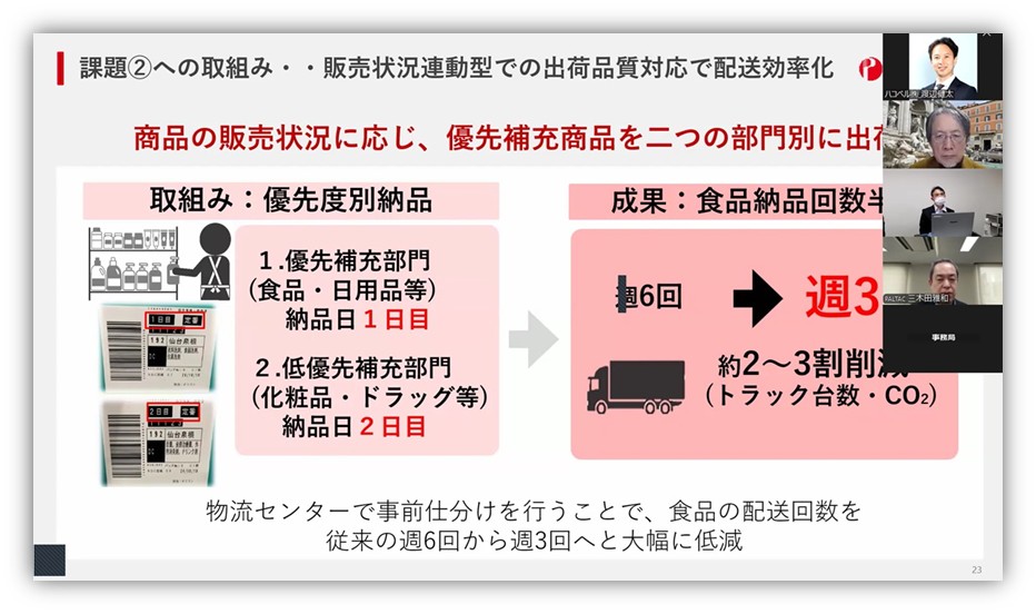 「人時を減らしながら薬王堂様の既存店の売り上げを伸ばすことに成功。同時にPALTACの物流センターの人時生産性も伸びました。トラックの走行台数・走行距離・CO2排出量も約20%減少し、製・配・販の各課題を解消することができました」と、和田氏は定量的な効果を説明しました。