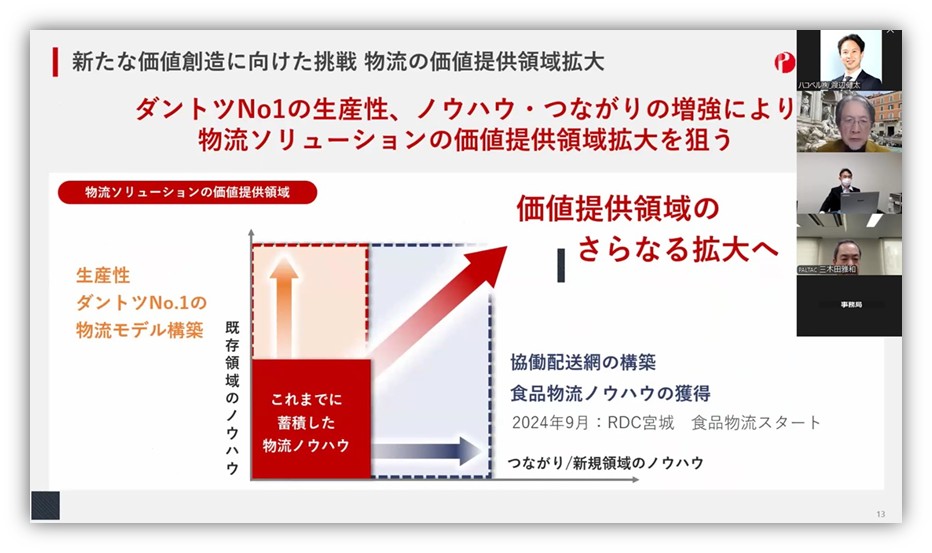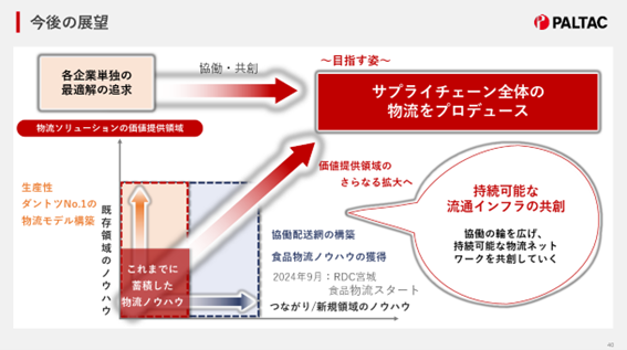 こうした動向を背景に、PALTACは生産性ダントツNo.1の物流モデルを構築し、既存領域を広げるとともに新たに共同配送網の構築と食品物流ノウハウの獲得を進め、価値提供領域のさらなる拡大をめざしています。