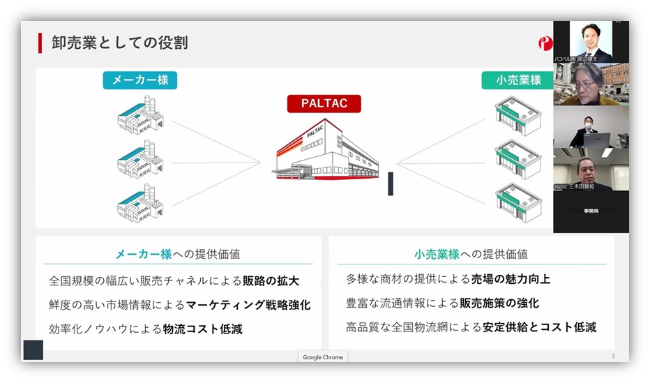 そして、これらの課題解決に株式会社PALTACが取り組んでいることを伝え、同社の和田秀夫氏を紹介。和田氏が登場して会社概要と卸売業の役割を説明しました。