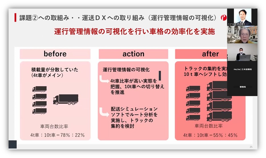 ・運行情報から4t車メインによる積載効率の低さを把握し、10t車の比率を上げた。
