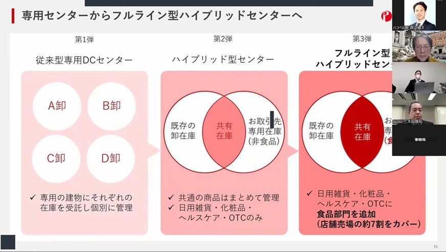 コメントいただいている通り、近年は集約化が進み、40年ほど前に2,000社以上あった卸売会社が10年前には約500社まで減り、現在は数社程度になっています。100社ほどの積み重ねで成り立っているPALTACは生活必需品50,000品目を取り扱い、年間35億点を出荷しています。取引先はメーカー1,000社、小売業400社(50,000店舗)。全国に19の拠点を展開して北海道から沖縄まで網羅していますが、設備の老朽化や人口分布の変化から再編を検討しています。