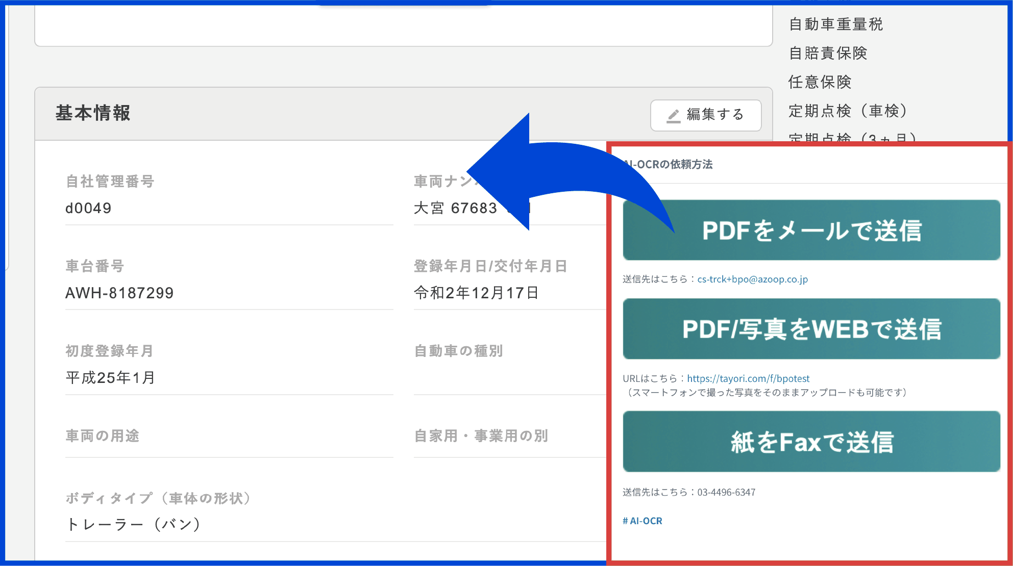 車両に関する各種情報をデジタル上で一元管理。車検証や請求書などファイルデータも全てアップロードができ、ペーパレス管理を実現