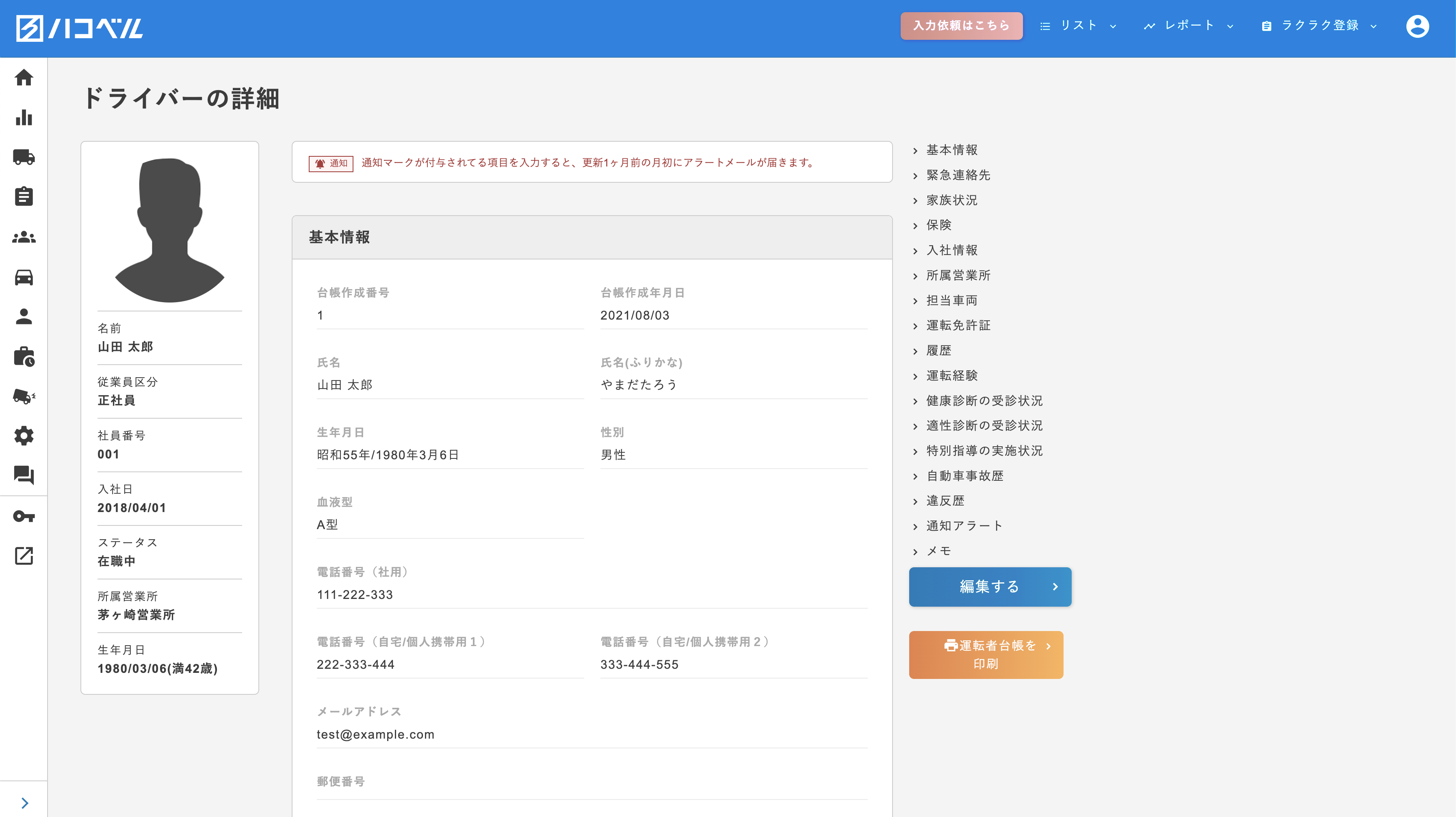 ・ドライバー管理機能(運転者台帳、免許証や健康診断、講習・研修系のアラート)