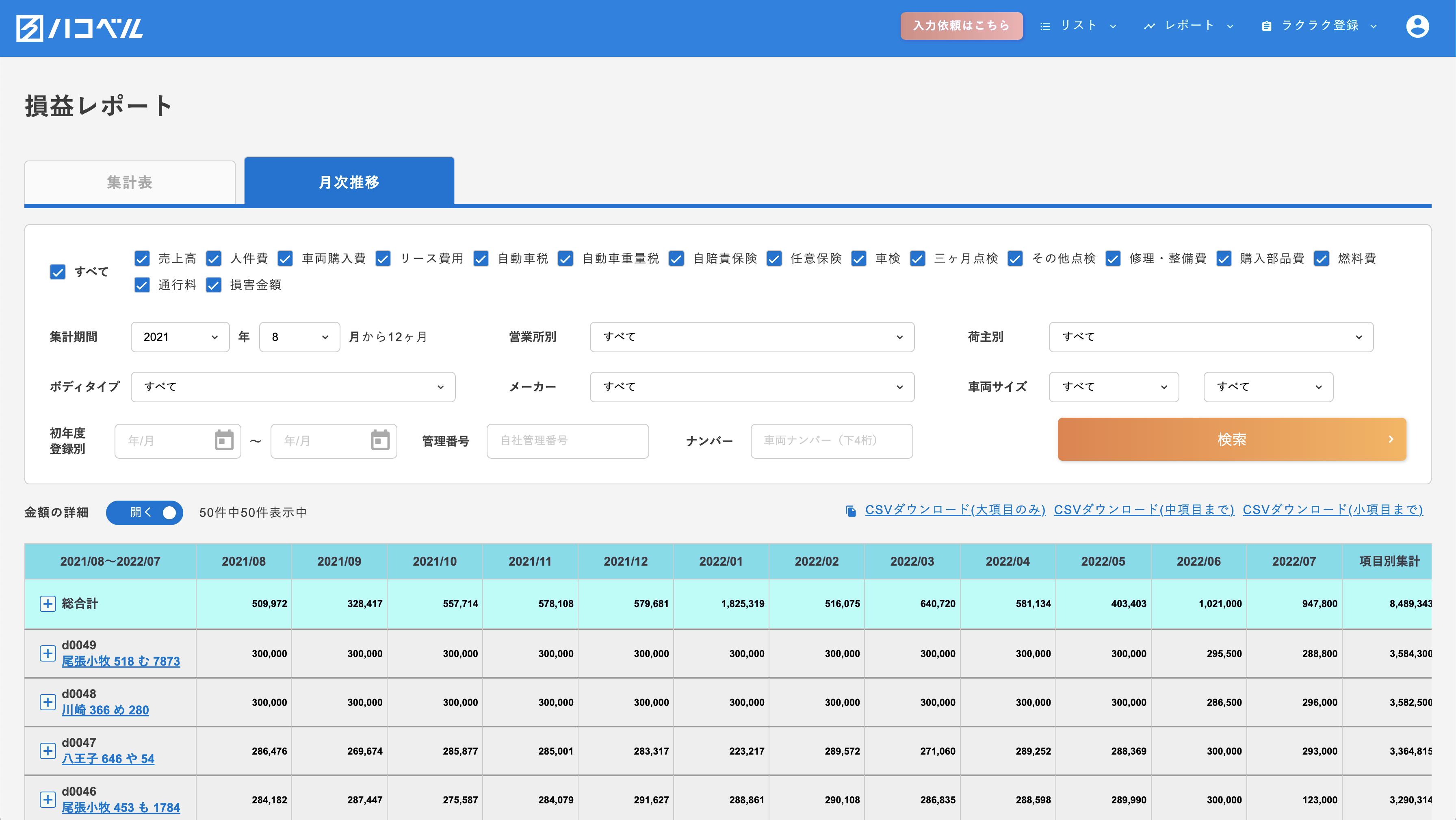 会社・営業所単位だけでなく、車両毎の損益を即座に集計。月次の推移の確認と、経年での集計が可能