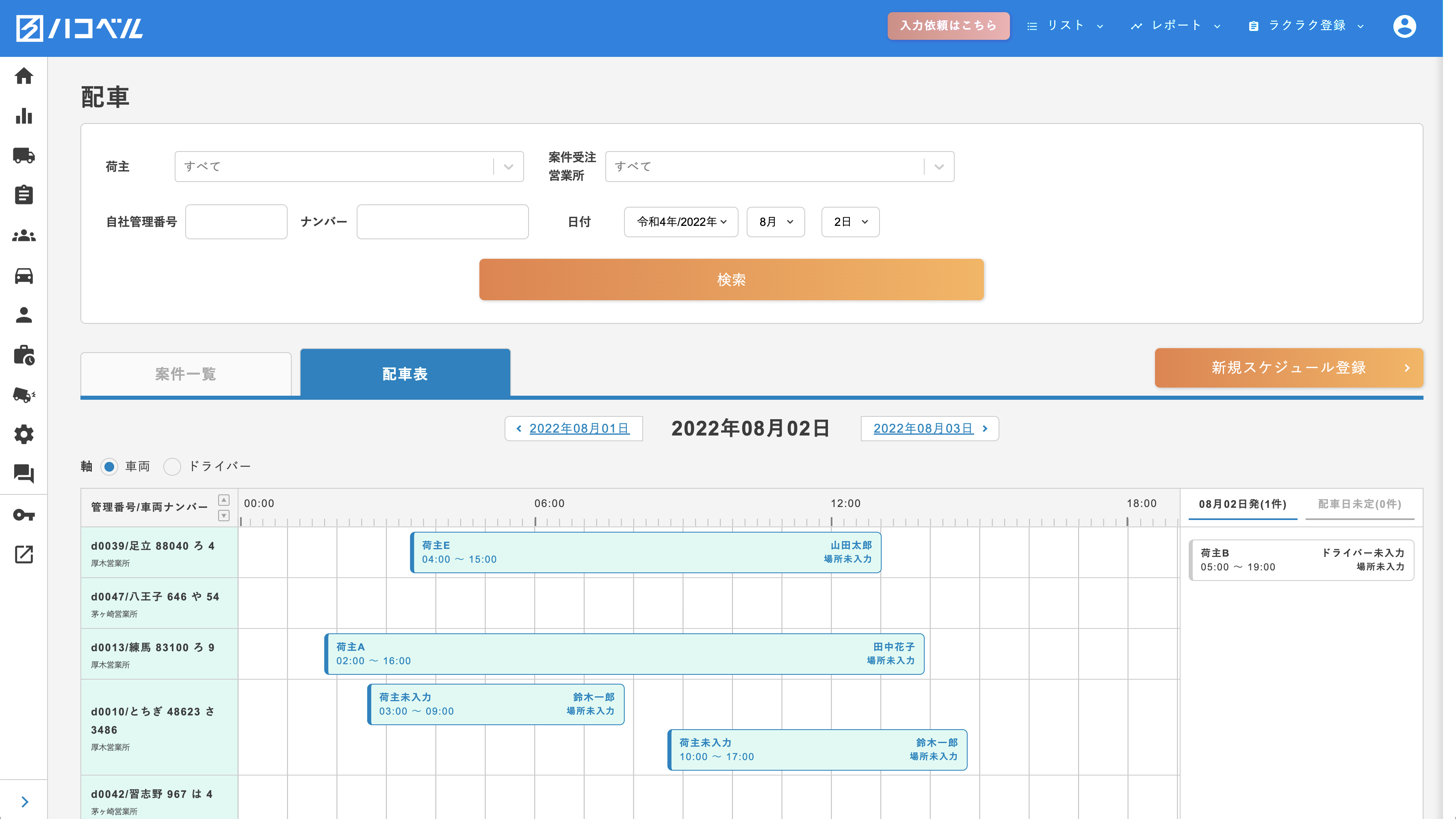 配車表をデジタル上で表現する事で、営業所を跨いだ配車状況の共有が可能。配車状況を共有する事で、営業所間のコミュニケーションを促し、自社稼働比率を高める
