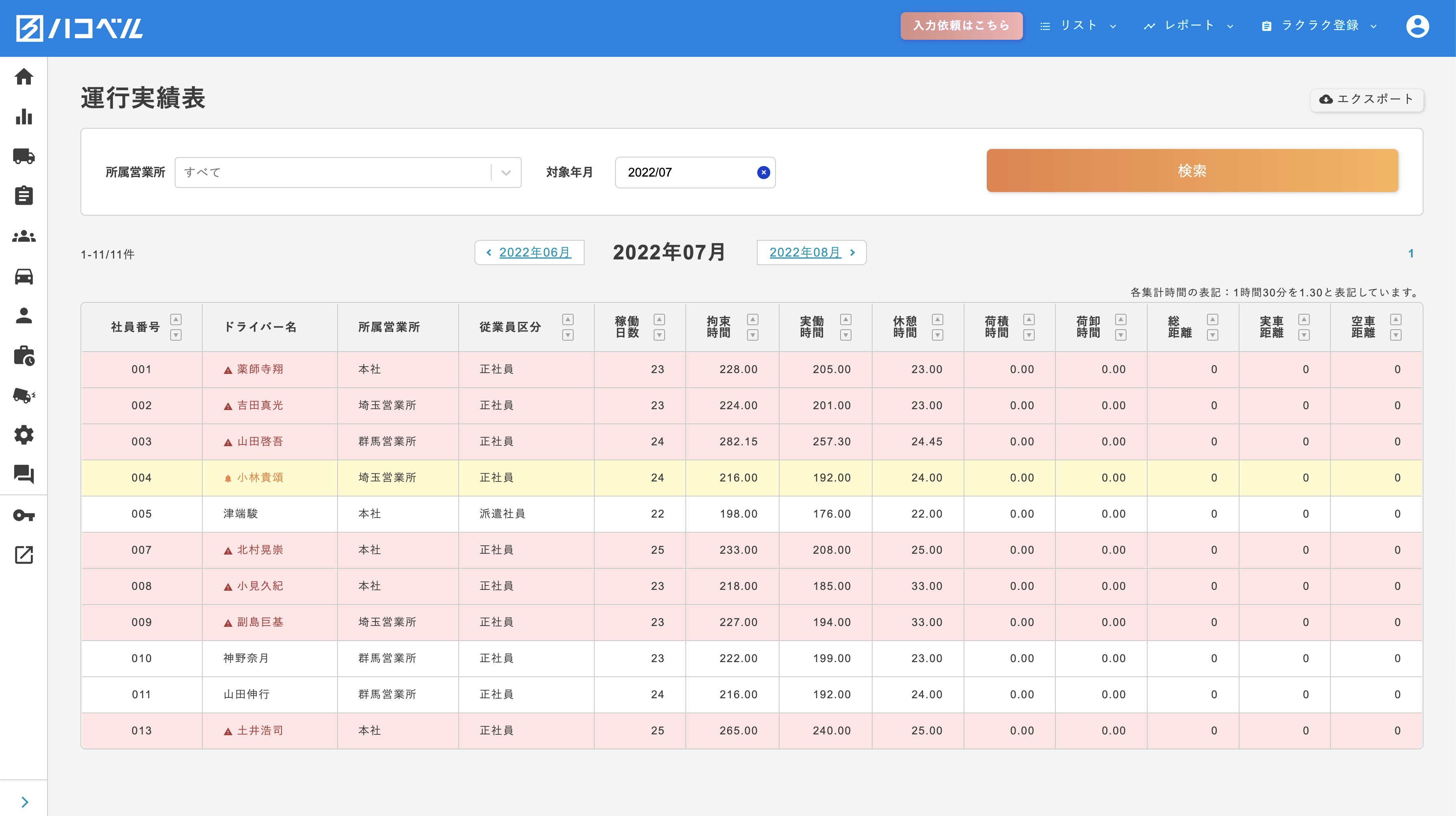 日々の日報情報を基に、ドライバー毎の労働時間を自動集計。2024年の働き方改革に向けた労働時間の徹底を、超過アラート機能などでサポート